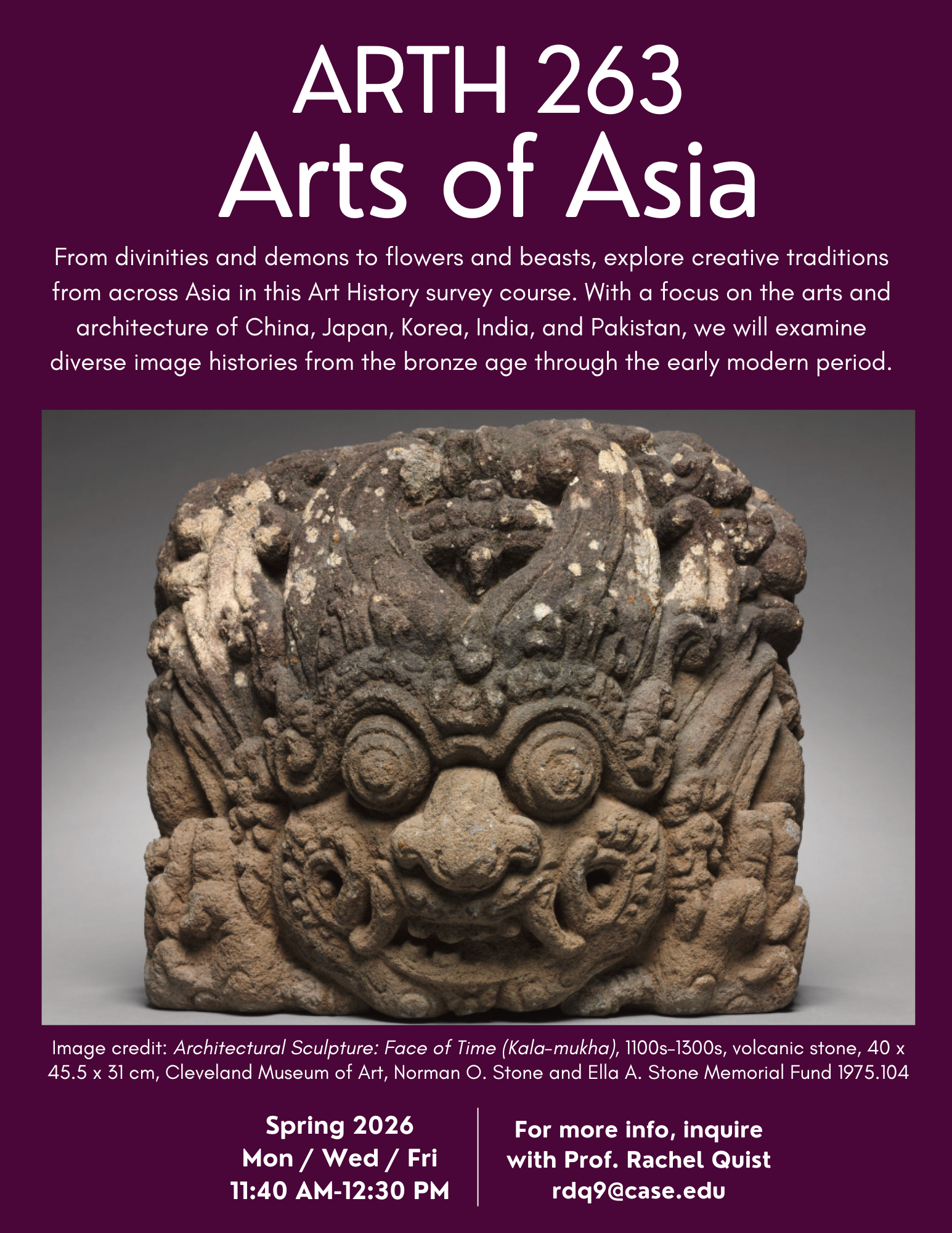 From divinities and demons to flowers and beasts, explore creative traditions from across Asia in this Art History survey course. With a focus on the arts and architecture of China, Japan, Korea, India, and Pakistan, we will examine diverse image histories from the bronze age through the early modern period.